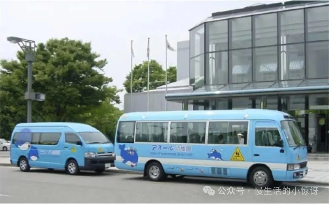 在门口和朋友们坐校车去学校。鲸鱼校车(くじらバス)最大、海豚校车(イルカバス)中等、曼波鱼(マンボバス)校车最小。
